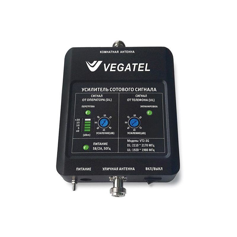 Частотный диапазон 2100 МГц имеет более высокую проницаемость сквозь стены, но ограниченную площадь действия. Чаще всего такие станции связи можно встретить в крупных городах и их окрестностях. Использование сетей 2100 МГц долгое время было ограничено из-за активного применения этих частот военными структурами. В отдельных регионах еще можно встретить зоны с нестабильным 3G-покрытием даже вблизи больших населенных пунктов. Для того, чтобы уловить сигнал от базовой станции, применяется уличная антенна «волновой канал» или антенна панельного типа. Далее, проходя через репитер, сигнал получает необходимое усиление и с помощью комнатной антенны распространяется внутри здания. В свою очередь, когда сигнал от вашего устройства (смартфона, модема и т. п.) попадает на комнатную антенну, он отправляется через репитер в сторону базовой станции. Репитер не может работать без подключения кабельных сборок и двух антенн.