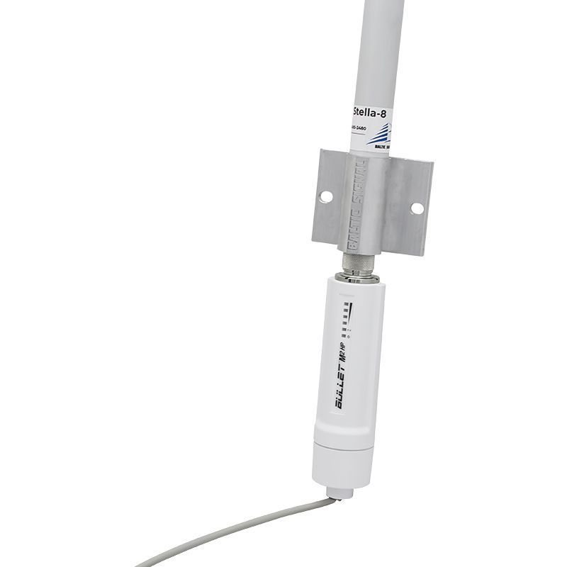 - Точка доступа повышенной мощности. К уличному блоку кабелем подсоединяется точка доступа Ubiquiti с выходной мощностью 600 мВт. Для лучшего покрытия с точкой доступа используется всенаправленная антенна Stella-8. Эта точка доступа способна обеспечить устойчивое WiFi-покрытие на площади 1 га.