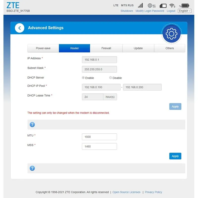 Настройка и управление модемом осуществляются через веб-интерфейс. Пользователь может изменить параметры WiFi-сети и маршрутизации, настроить сетевой экран (файервол), а также узнать текущий уровень сотового сигнала в децибелах. Руководствуясь точным значением мощности сигнала, можно быстро подобрать оптимальное положение внешней антенны.