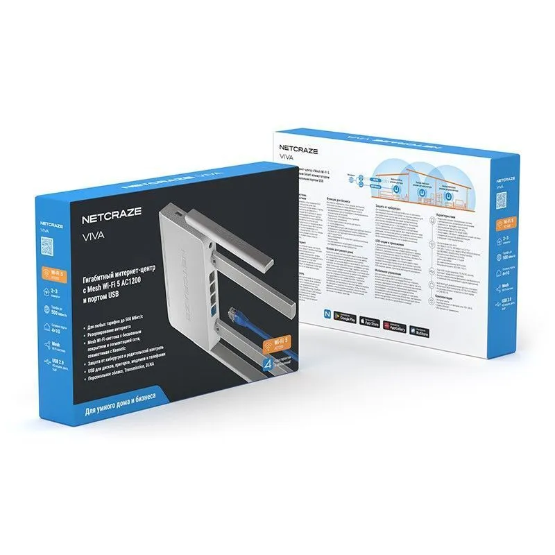 Netcraze Viva — современный и функциональный интернет-центр, объединяющий поддержку Mesh Wi‑Fi 5 AC1200, встроенный 4‑портовый Smart-коммутатор для подключения нескольких проводных устройств и многофункциональный USB‑порт для принтеров, накопителей, модемов или медиасервера.