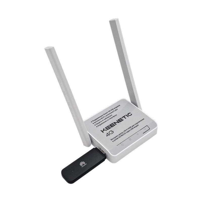 Keenetic 4G не имеет встроенного 3G/4G-модуля, поэтому для доступа к мобильной сети в комплект включен USB-модем Huawei E3372 со слотом для SIM-карты. Модем подключается к USB-порту роутера, автоматически распознается устройством и осуществляет подключение к сети сотового оператора.