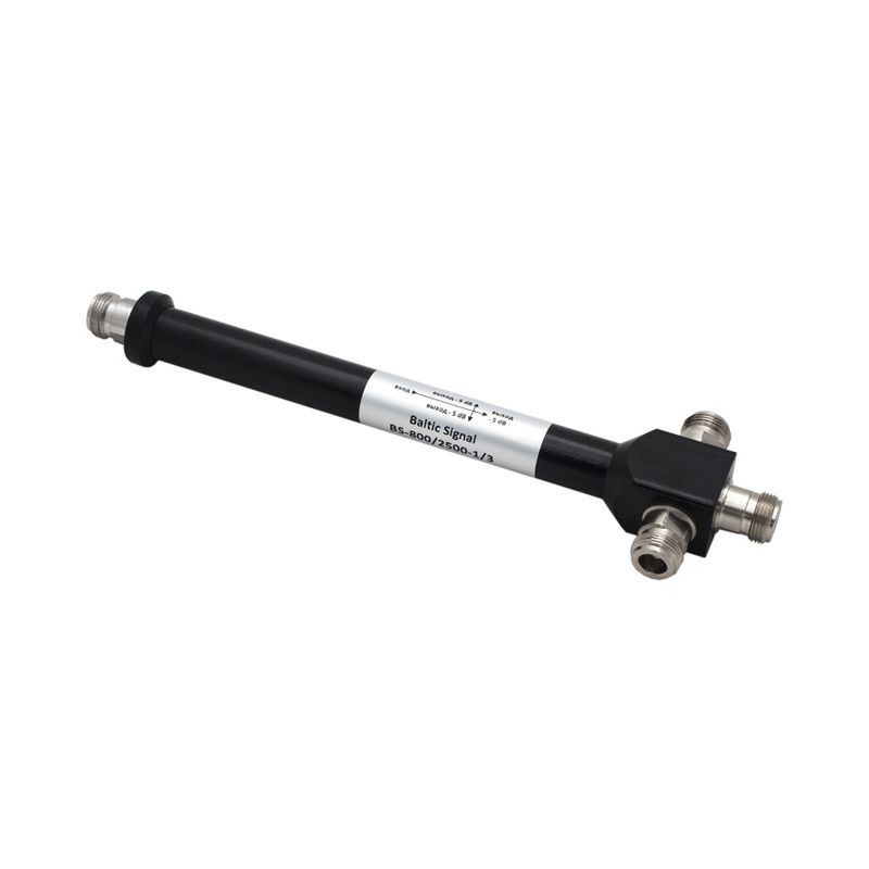 Сплиттер сигнала BS-800/2500-1/3 применяется в системах повышения качества голосовой связи и мобильного интернета для формирования нескольких отдельных потоков из единого радиоканала или суммирования сигнала из нескольких источников. Использование прибора позволяет расширить зону действия репитера внутри здания при помощи нескольких отдельных комнатных излучателей. Помимо этого, устройство можно использовать для суммирования слабого сигнала от нескольких уличных антенн мобильной связи. Делитель поддерживает ВЧ-сигнал в диапазоне частот 800–2500 МГц и имеет сопротивлением 50 Ом.