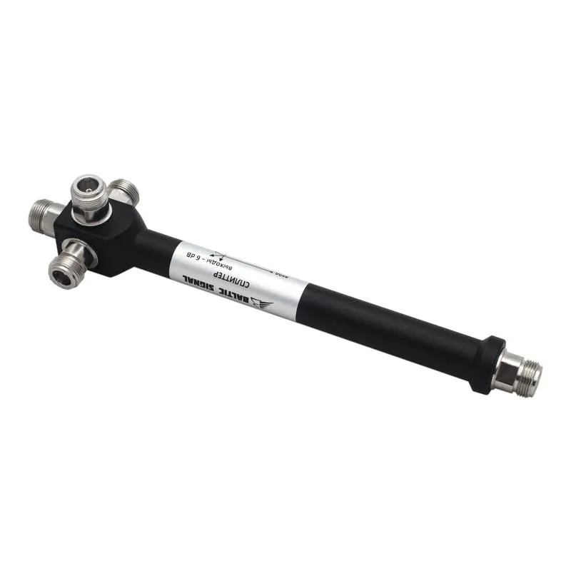 Сплиттер BS-800/2700-1/4 имеет исполнение в виде круглой трубки и обеспечивает минимальные вносимые потери. Мощность на каждом выходе уменьшается на 6 дБ (равномерное деление сигнала на 4 части). Предельная пропускная мощность устройства ограничена значением 100 Вт. Подключение устройств к делителю производится при помощи кабеля с наконечниками N-типа (все разъемы делителя — N-female).