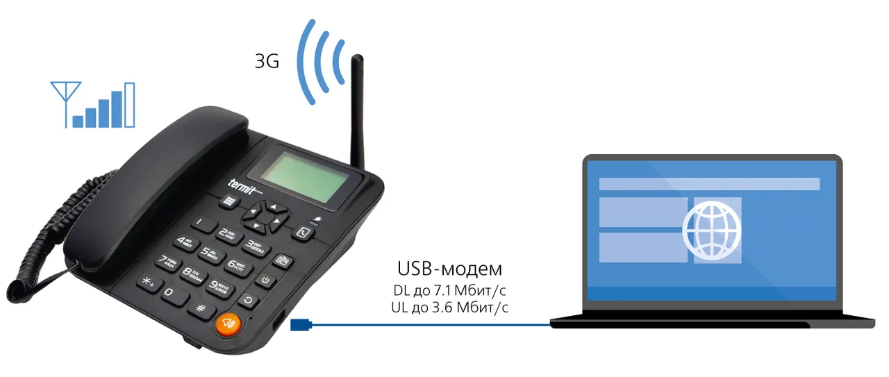 Помимо скорости телефонизации WCDMA-телефон Termit FixPhone 3G незаменим там, где качество сотовой связи низкое или она вовсе отсутствует на обычных мобильных телефонах — к антенному разъему телефона можно подключить вместо штатной усиленную внешнюю антенну для сетей GSM 900/1800 и WCDMA 900/2100. Кроме того, телефон может использоваться в качестве 3G/USB-модема для организации доступа в сеть Интернет на скорости до 7.2 мбит/с.